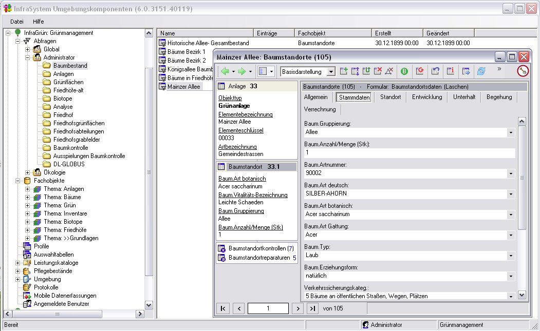 Bearbeiten der Sachdaten zu Baumstandorten (Grundlage: Abfrage auf Baumstandorte einer Straße) |