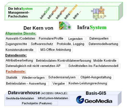ist somit das Basisprodukt, welches unter allen Fachschalen liegt und die Verbindung zu den Datenbanken (und zum darin abgebildeten Datenmodell), zu MS-Office und zum Basis-GIS GeoMedia realisiert. InfaSystem ist somit als ein standardisierter Fachschalenkern mit Diensten sowie Frameworks für die verschiedenen Implementierungsformen der Fachschalen zu verstehen: