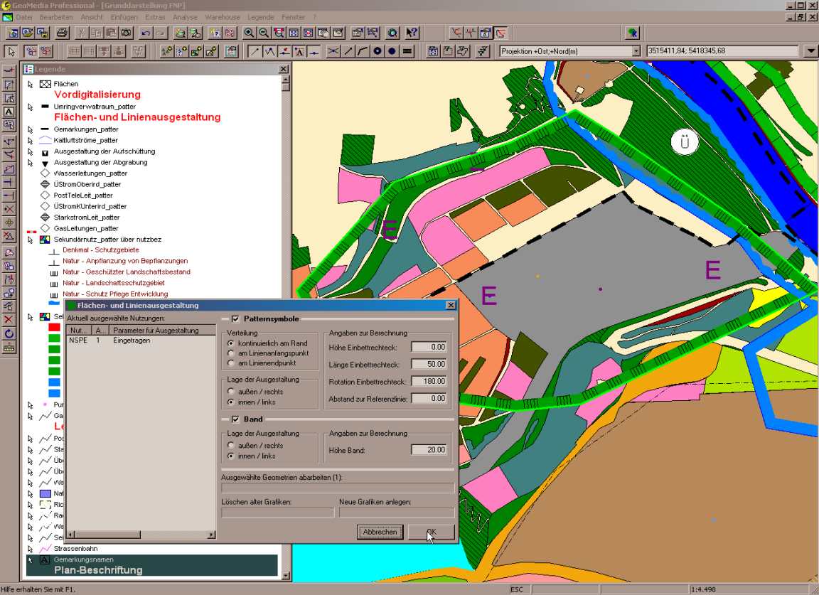 Umfangreiche Einstellungen zur Positionierung und Ausprägung der linienbegleitenden Symbole und Bänder (Pattern: Einbettrechtecklänge/-höhe, Drehwinkel, Position im Linienabschnitt, Abstand zur Bezugslinie, rechts/links oder innen/außen) (Band: Höhe, rechts/links,oder innen/außen). Speichern aller Einstellungen nach der Objektnutzung oder allgemein für das Objekt in Ausgestaltungskatalogen